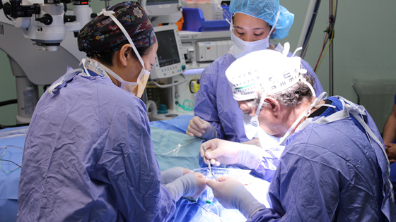 Dr. Robert Devenyi (right) and his surgical team are the first in Canada to successfully implant a retinal prosthesis that will restore a form of vision to blind patients. In this photo, he delicately implants the the internal portion of the device around the patient’s eye (Photo: UHN)